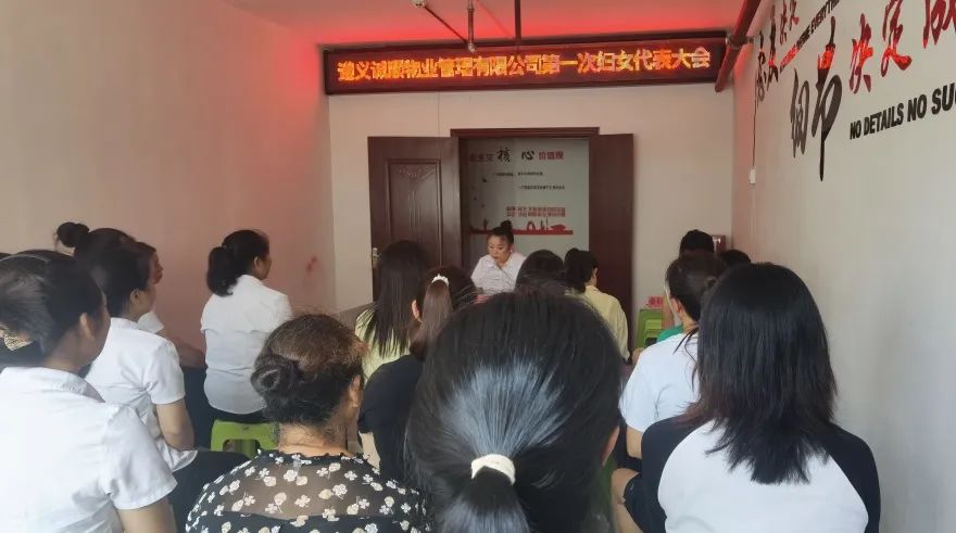 为进一步扩大妇联组织在 “三新” 领域的有效覆盖,团结引领广大妇女在经济社会发展中发挥 “半边天” 作用。7 月 30 日,遵义诚顺物业管理有限公司第一次妇女代表大会顺利召开,选举产生了遵义诚顺物业管理有限公司妇联第一届执委会执委11名、主席1名、副主席2名。