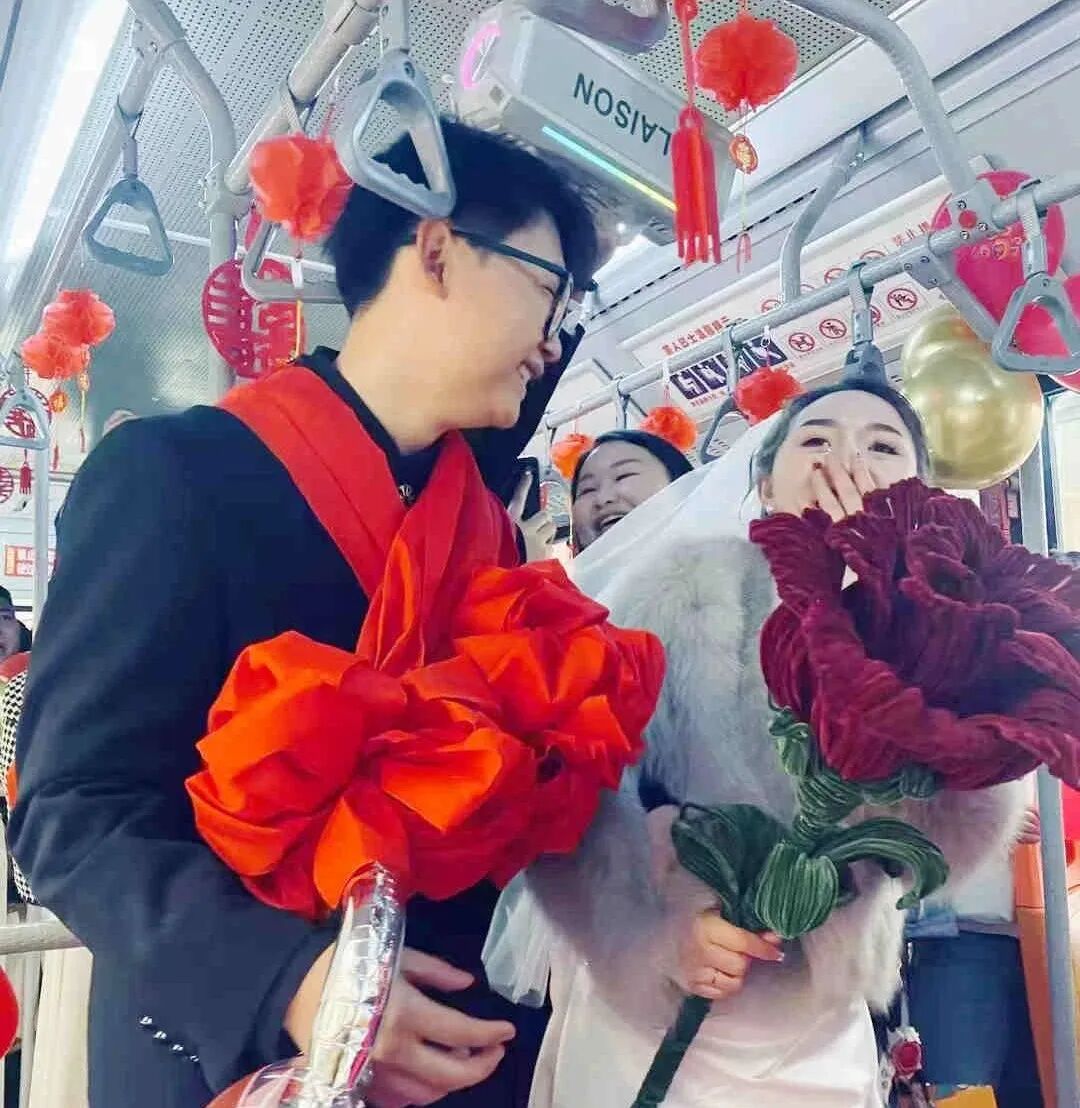 当天上午9点,这辆公交车停在了湄潭县城太子湾小区门口,车头悬挂的大红花和国风窗花与大红车身相得益彰,散发着浓厚的喜庆氛围。走进车厢,只见扶手杆和座椅上精心装点着红色国风“囍”字、气球、拉花以及“新婚快乐”等祝福语挂件,整个车厢充满了新婚的甜蜜与温馨。