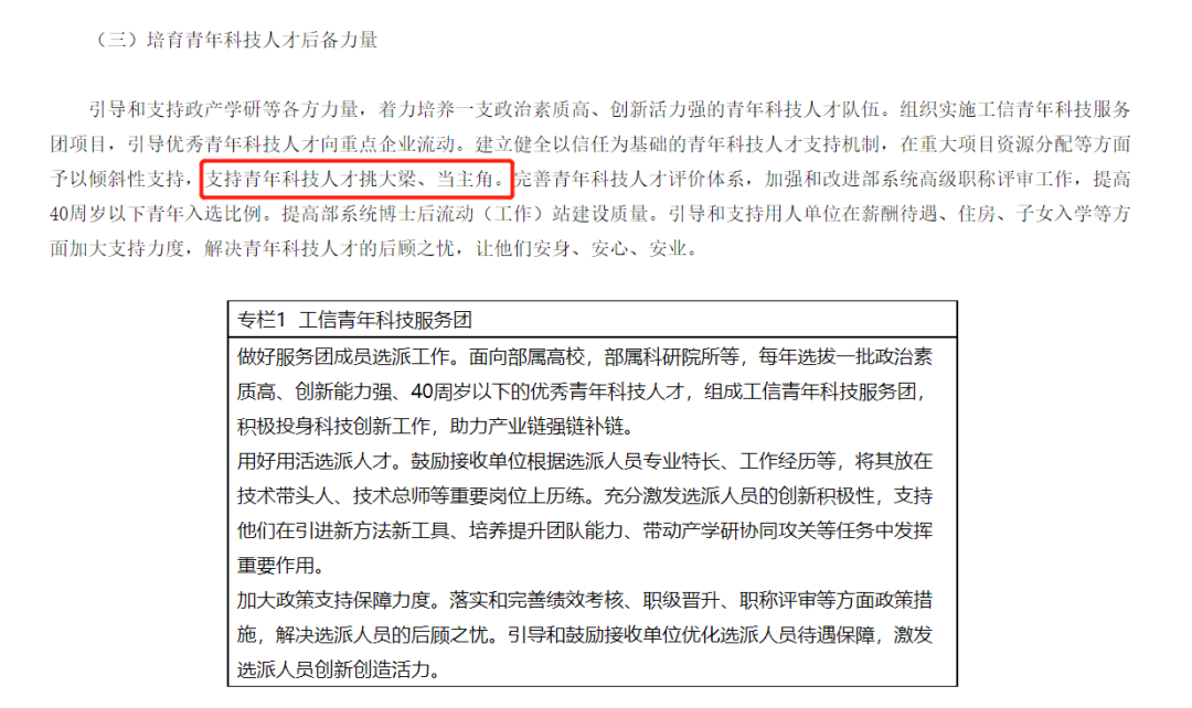 《意见》具体提出,要引导和支持政产学研等各方力量,着力培养一支政治素质高、创新活力强的青年科技人才队伍。组织实施工信青年科技服务团项目,引导优秀青年科技人才向重点企业流动。建立健全以信任为基础的青年科技人才支持机制,在重大项目资源分配等方面予以倾斜性支持,支持青年科技人才挑大梁、当主角。完善青年科技人才评价体系,加强和改进部系统高级职称评审工作,提高40周岁以下青年入选比例。提高部系统博士后流动(工作)站建设质量。