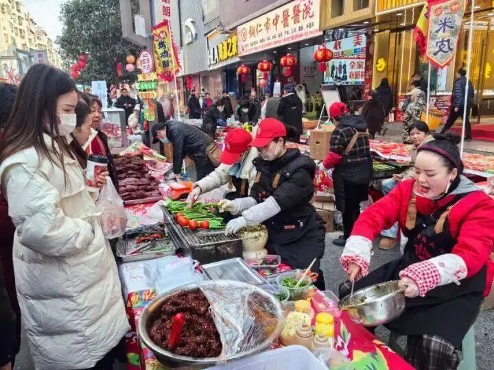 年货场里,各种年货应有尽有,除了常规的美食小吃、腊肉香肠是人们心之所向的必备美食外,文创产品、非遗产品、农特产品等也成为“新宠”,开拓出新的消费赛道,吸引了不少市民驻足品尝、购买。