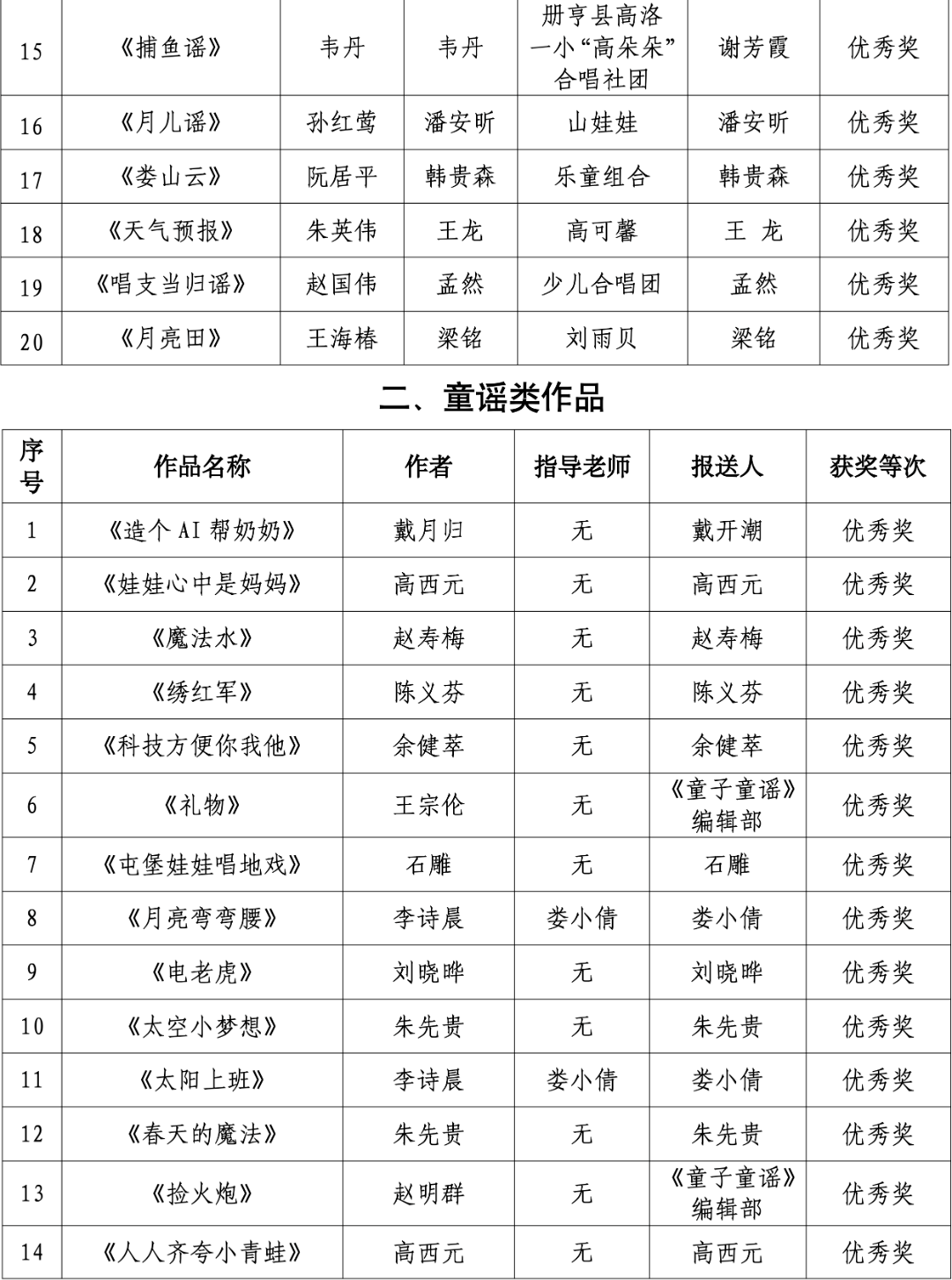附件:首届“多彩童声·快乐畅享”少儿歌谣创作征集传唱活动获奖作品名单