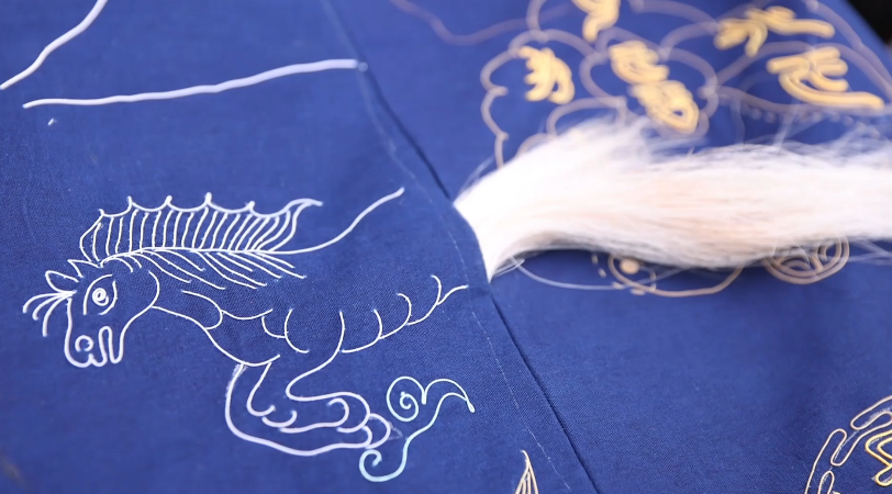 马尾绣,素有“刺绣活化石”之称。它以马尾缠丝为芯,外绕彩色丝线,工艺繁复细腻。这幅《奔腾骏马图》从构思到完成,历时两月有余。每一针、每一线,勾勒的不仅是骏马奔腾的姿态,更传递着水族人对幸福生活的向往。