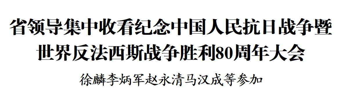 9月3日上午,纪念中国人民抗日战争暨世界反法西斯战争胜利80周年大会在北京天安门广场隆重举行。省委书记徐麟,省委副书记、省长李炳军,省政协主席赵永清,省委副书记马汉成,省委常委,省人大常委会、省政府、省政协领导班子成员和党组成员,省军区、省法院、省检察院、武警贵州省总队主要负责同志在省委机关集中收看或在各机关驻地分别收看实况直播。
