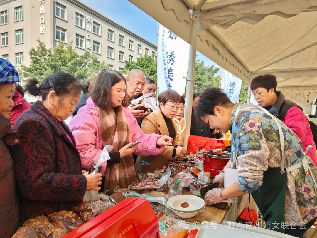 展售活动现场人气爆棚,来自全州各县市的妇女特色手工产品,以其独特的民族风格和精湛的工艺,迅速点燃了现场的热情。布依刺绣、纺纱、织布、印染等传统手工艺品,以其独有的魅力,吸引了众多消费者驻足购买,布依灰粽、普安红茶、农家腊肉等农特产品更是销售火爆,获得了消费者的一致好评。