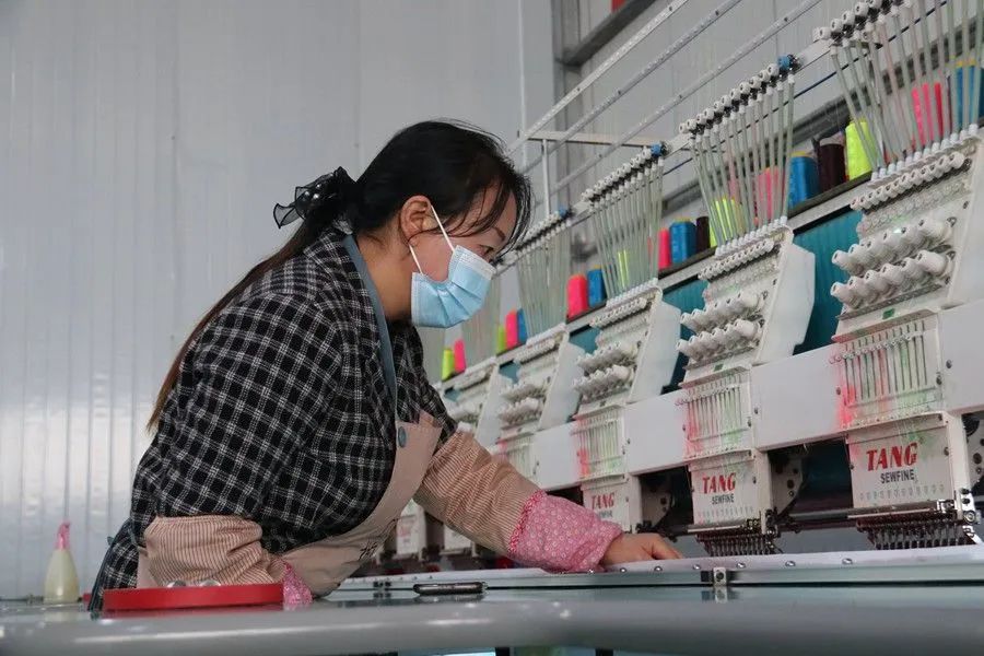 七星关区观音桥街道五里坪社区民族服饰加工厂,工人正在操作设备。(夏文婧 摄)