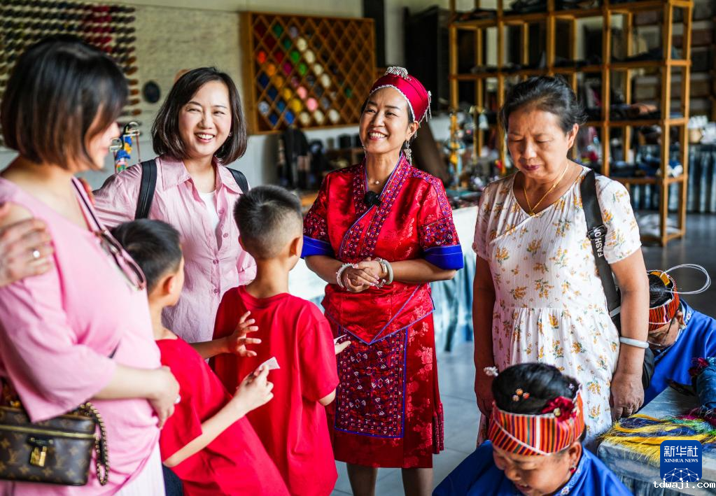 龙禄颖在位于贵州省施秉县的舞水云台非遗工坊和游客交流(10月10日摄)。新华社记者 陶亮 摄