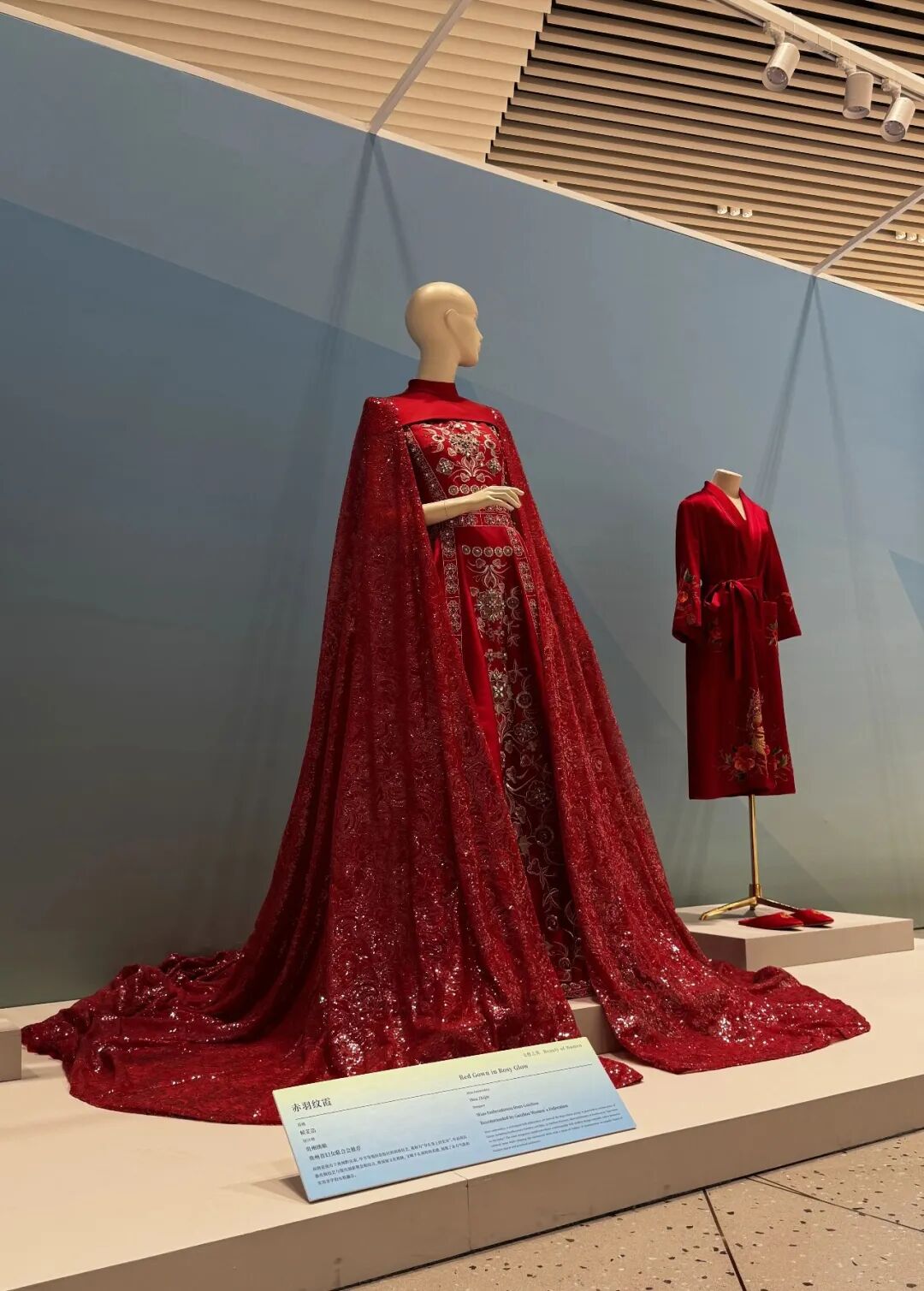 为苗绣作品,由设计师候芷洁联合贵州绣娘设计制作。苗绣是流传于贵州黔东南、毕节等地的苗族民间刺绣技艺,被称为“穿在身上的史诗”。作品将民族传统技艺与现代创新理念相结合,既保留文化根脉,又赋予礼裙时尚美感,展现了东方气韵和实用美学的有机融合。